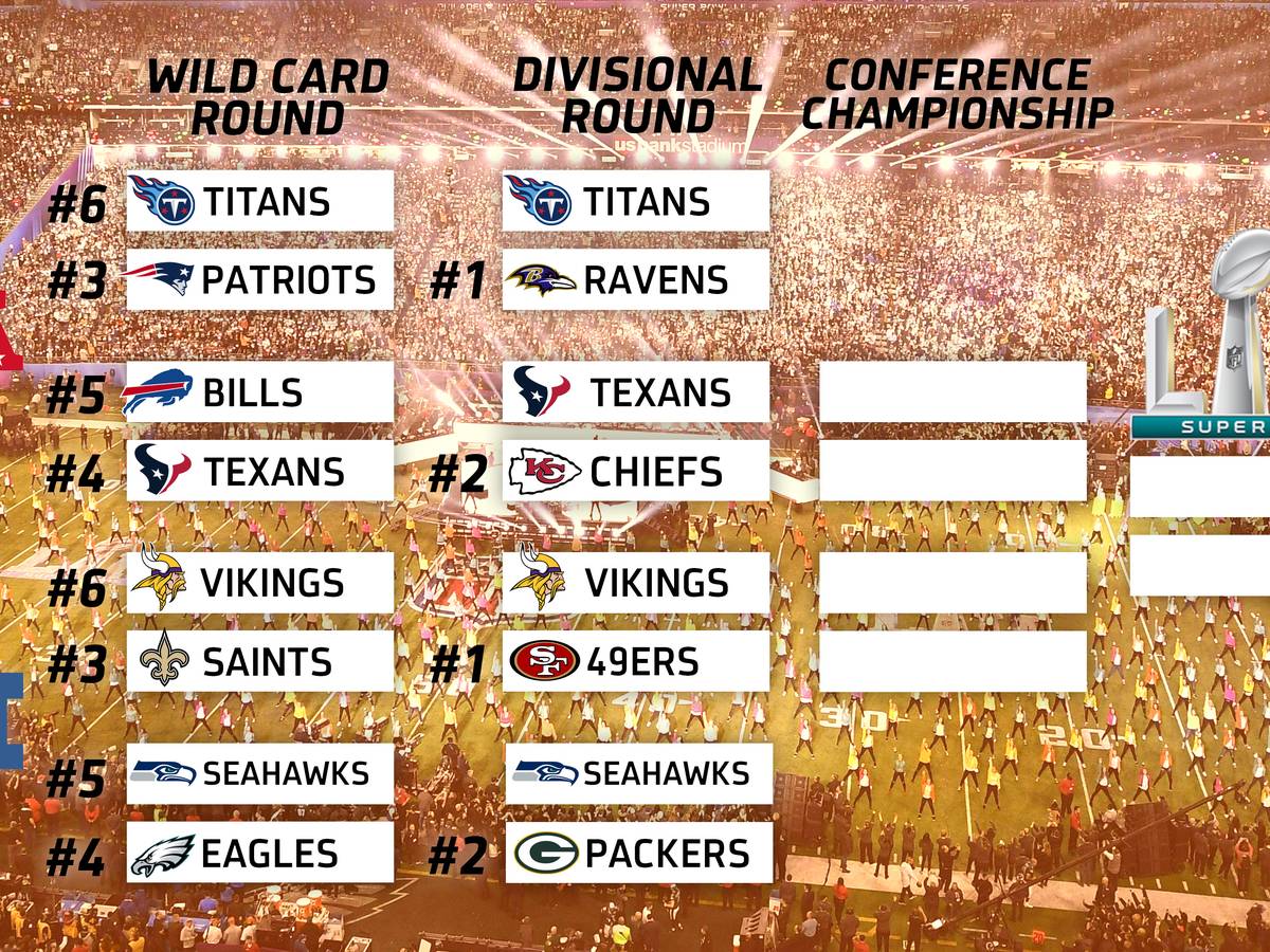 Play Off Baum Nfl 2021 : Play Offs Nfl Wikipedia - Although the matchup for super bowl sunday has not been set yet, the nfl released the kickoff time and broadcast info for super bowl sunday weeks in advance of the event.. Who is playing in the super bowl? The kansas city chiefs and green bay packers are the top seeds. Want more nfl news and analysis? How far will they go? Click here for spreads, totals and props for both games, including the nfl super bowl odds 2021.